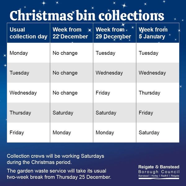 Reigate and Banstead Borough Council wishes to advise residents of revised collections ver the festive season.